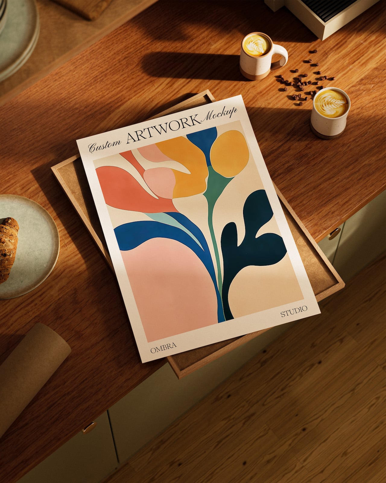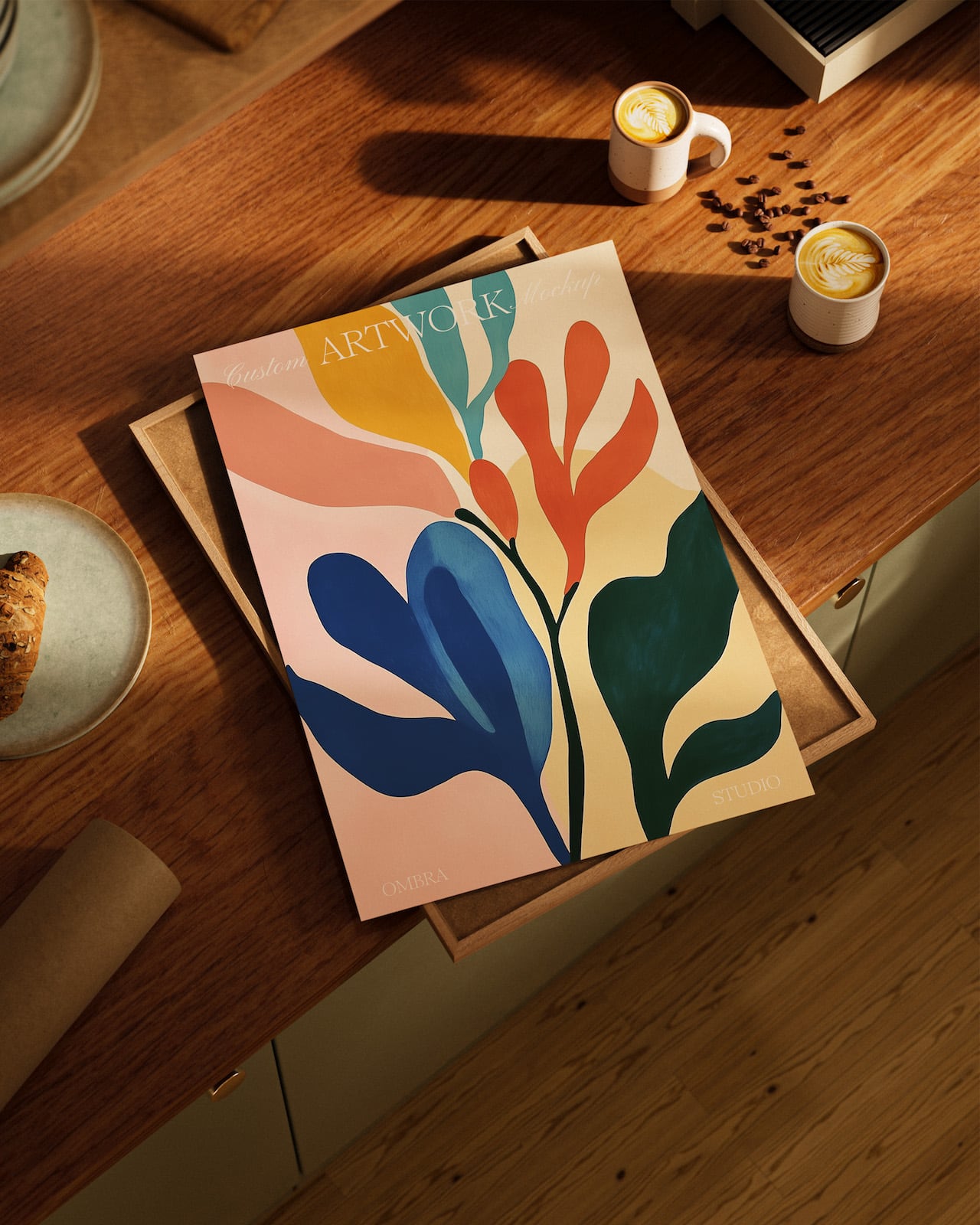 Soft lighting and warm natural wood tones make this frame mockup perfect for kitchen themed prints. The Photoshop frame mockup (PSD) allows you to easily add your design, resulting in a super stylish showcase! Our stylish kitchen scene is great for showing off food and drink related prints or artwork.