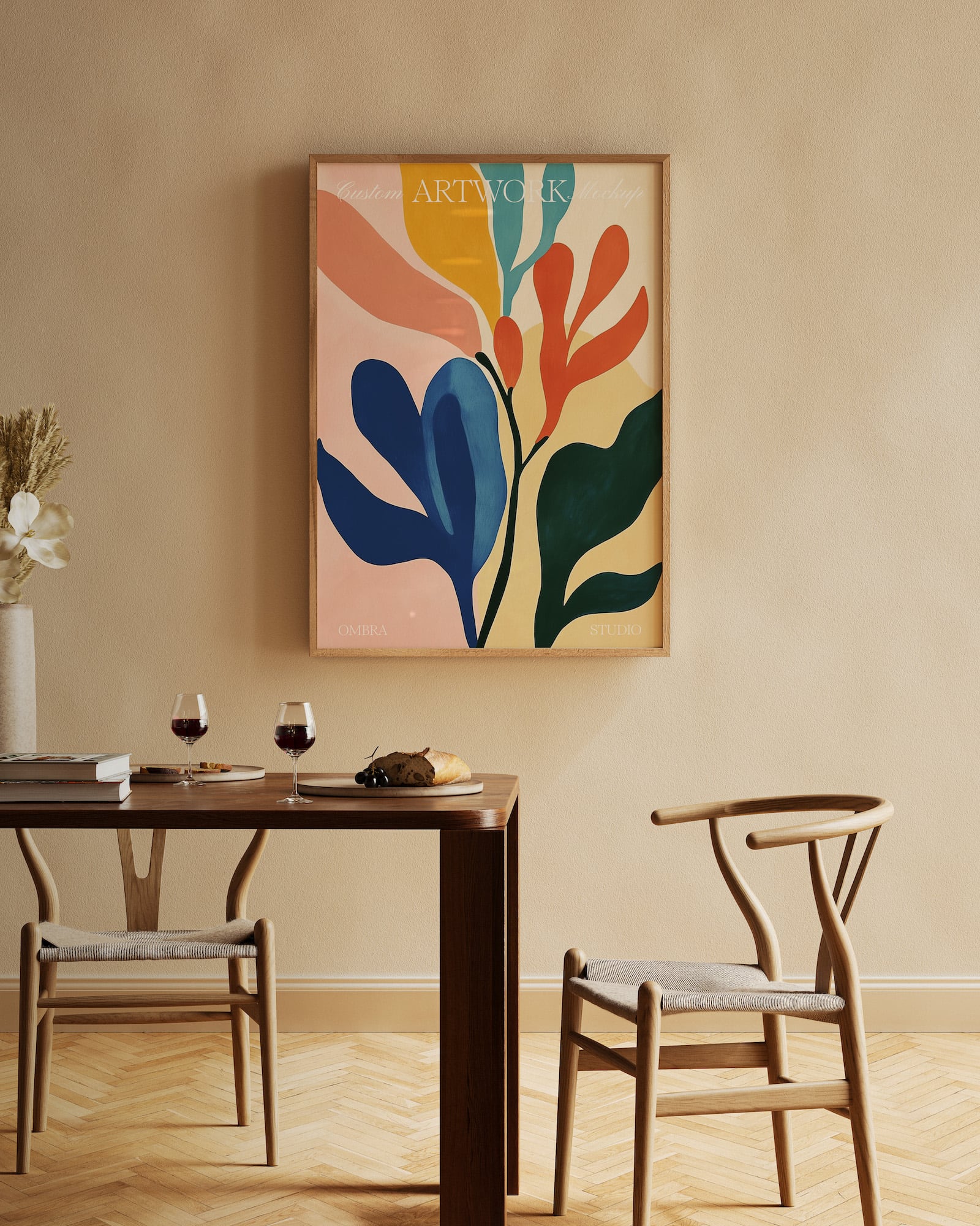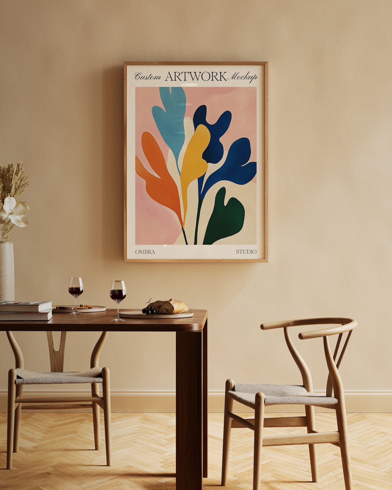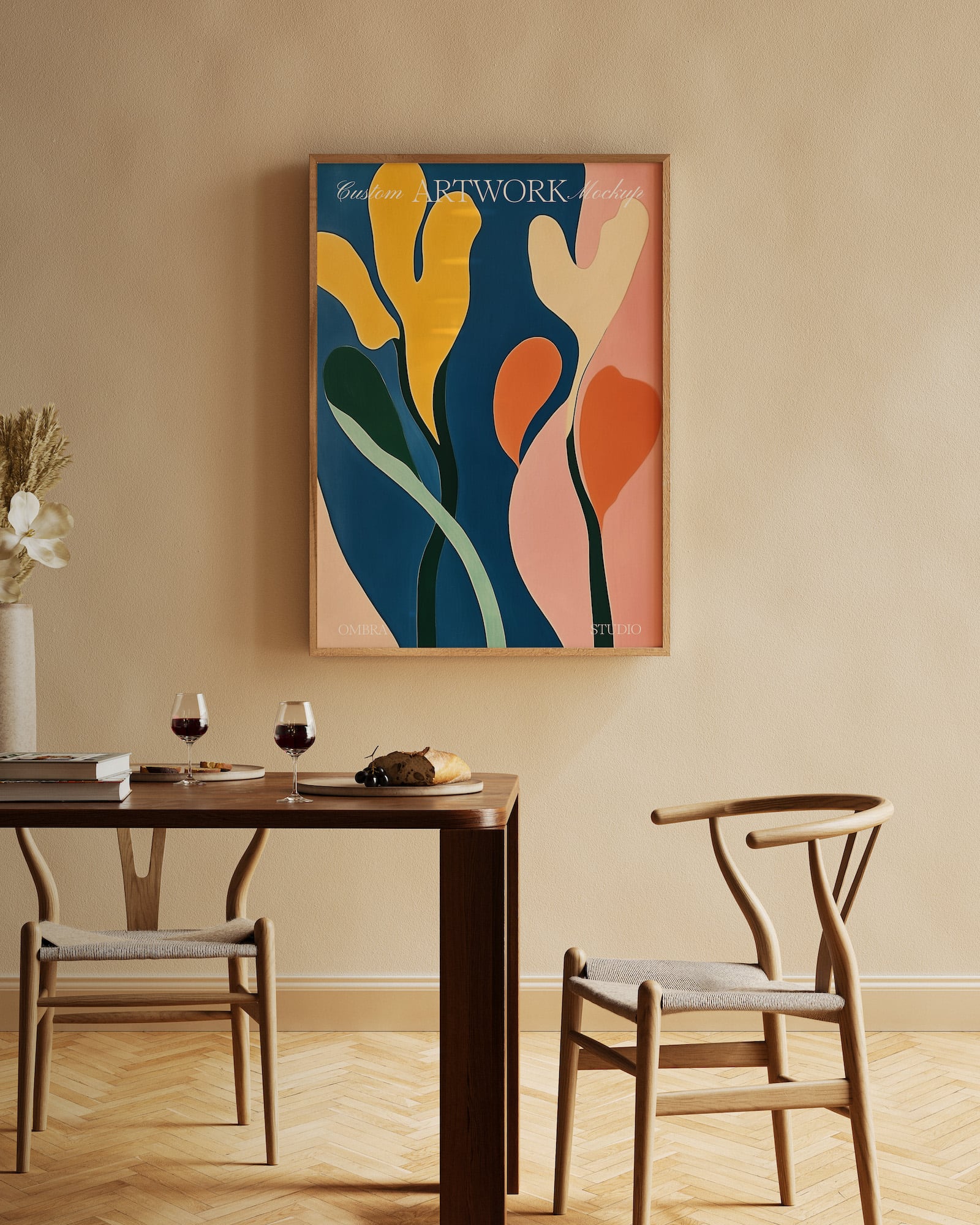Our dining room mockup is perfect for showing off food and drink themed prints in style. Featuring a beautiful minimal dining room scene with a DIN A format wood frame that you can add your artwork to via smart layers in the Photoshop file.