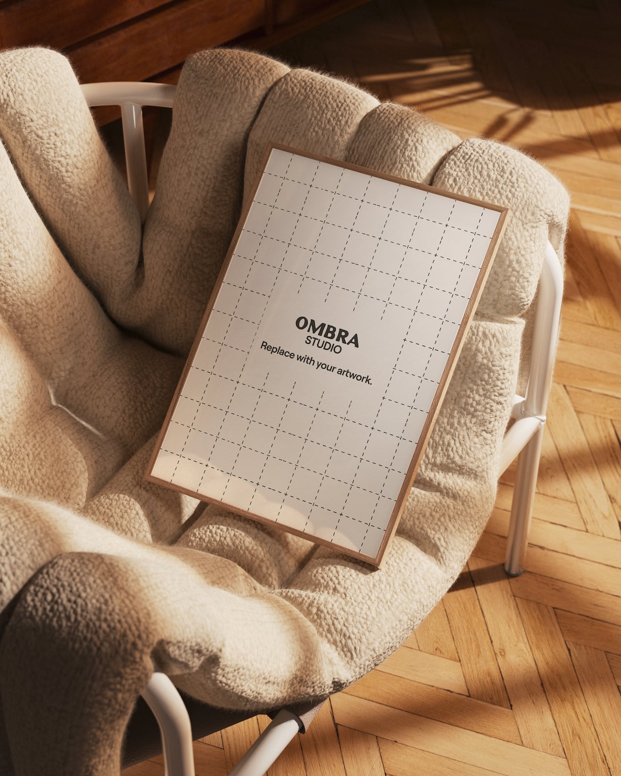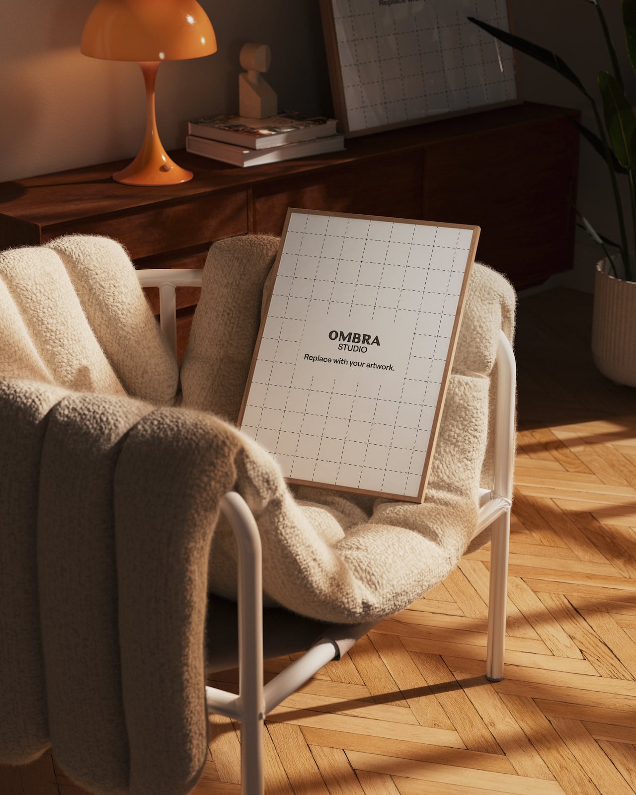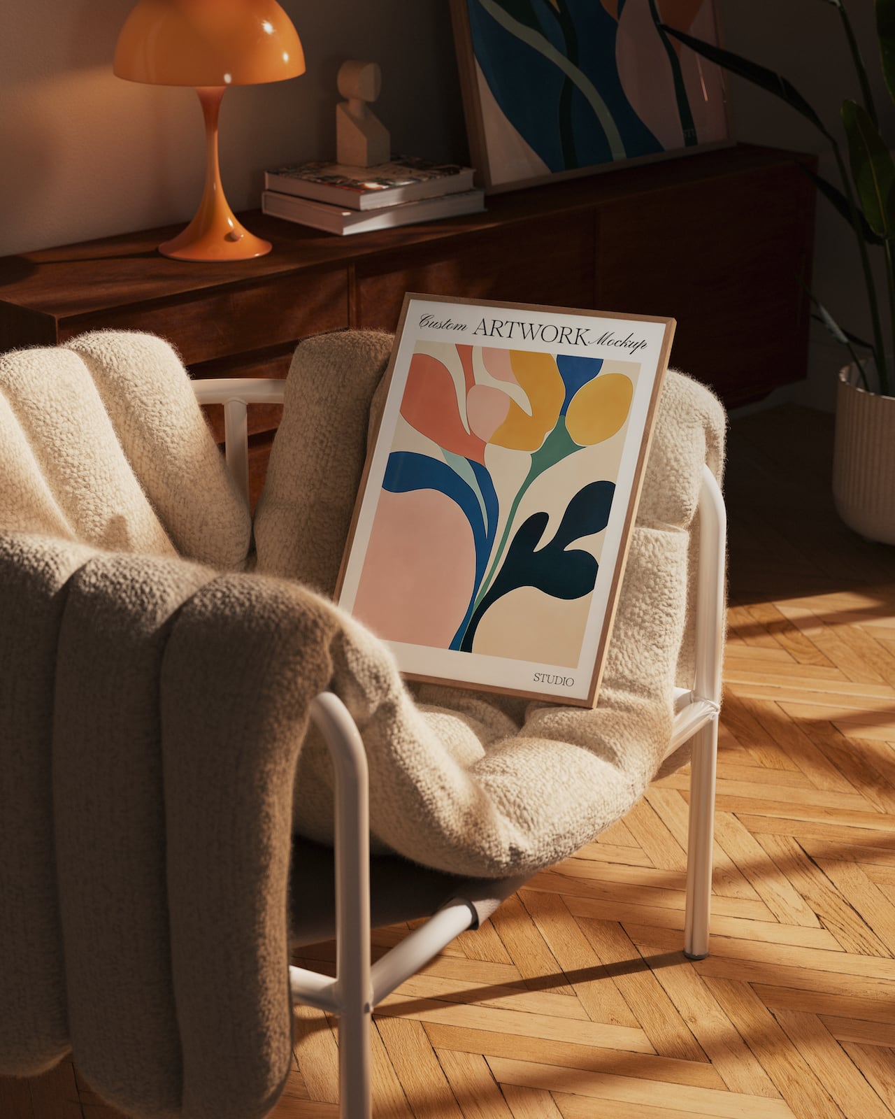 A simple and stylish mockup featuring a wood DIN A format frame sitting on a soft boucle arm chair within a mid century style interior scene. This product includes 2 Mockup versions; one that is close up and one that is more zoomed out.
