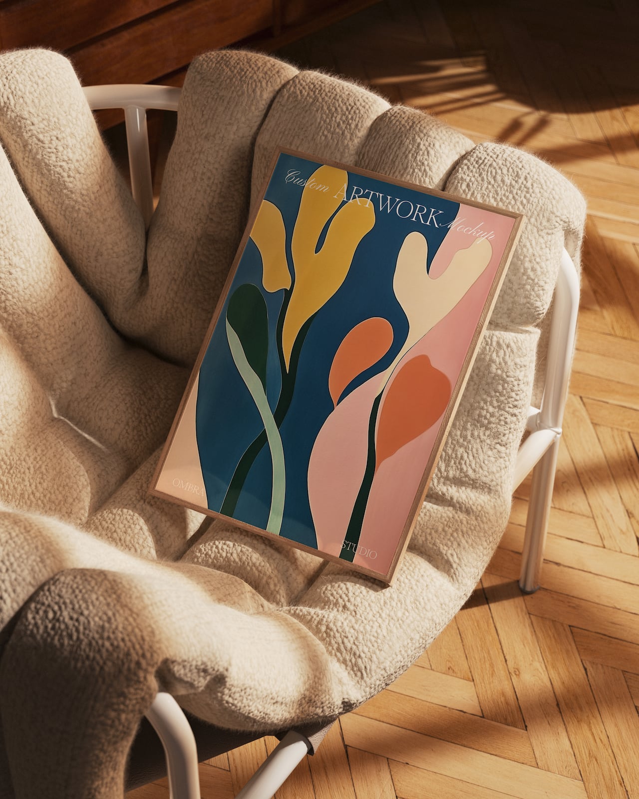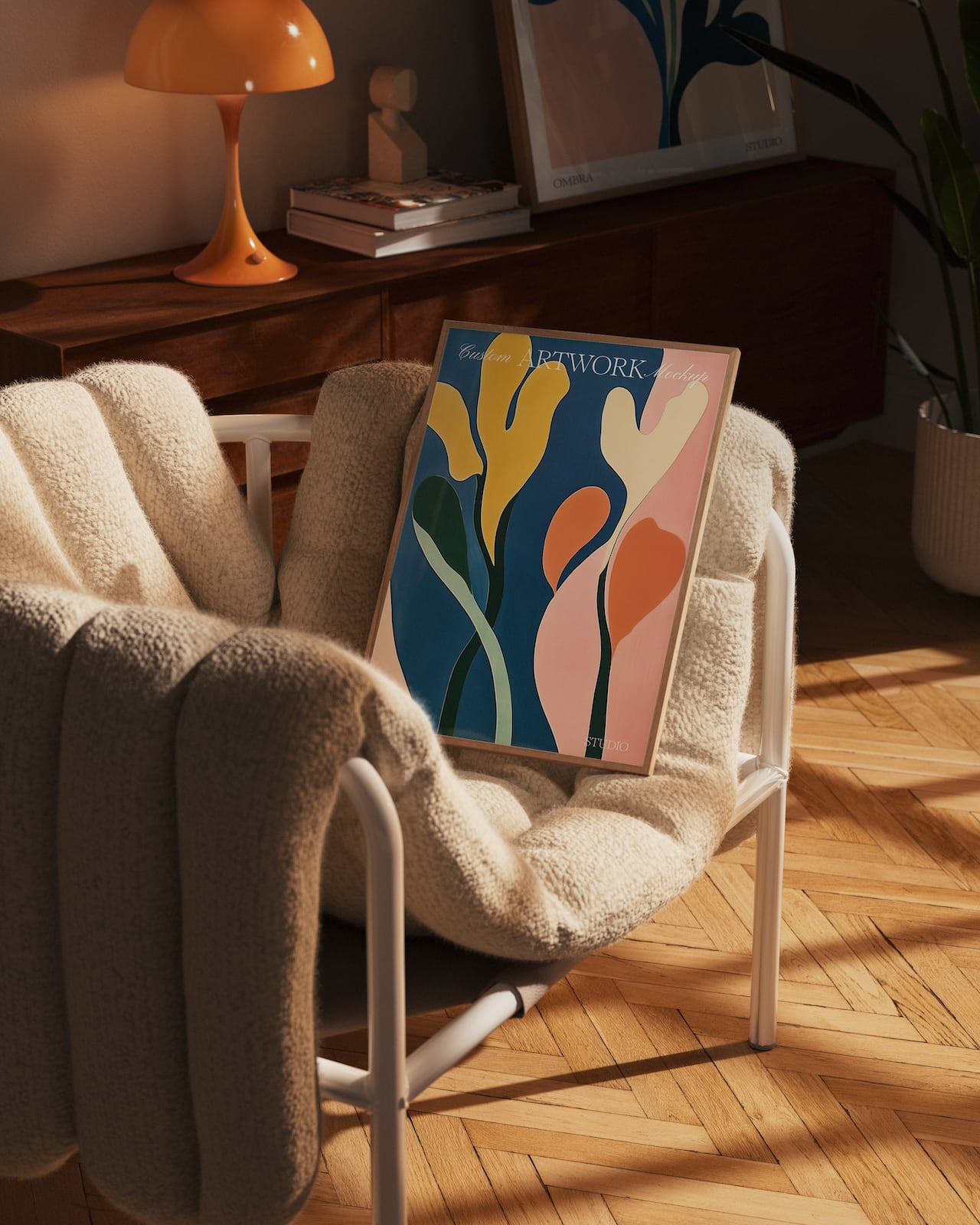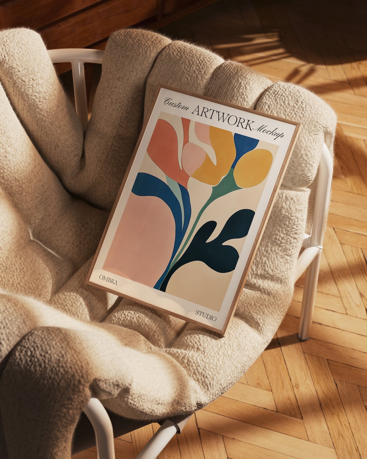 A simple and stylish mockup featuring a wood DIN A format frame sitting on a soft boucle arm chair within a mid century style interior scene. This product includes 2 Mockup versions; one that is close up and one that is more zoomed out.
