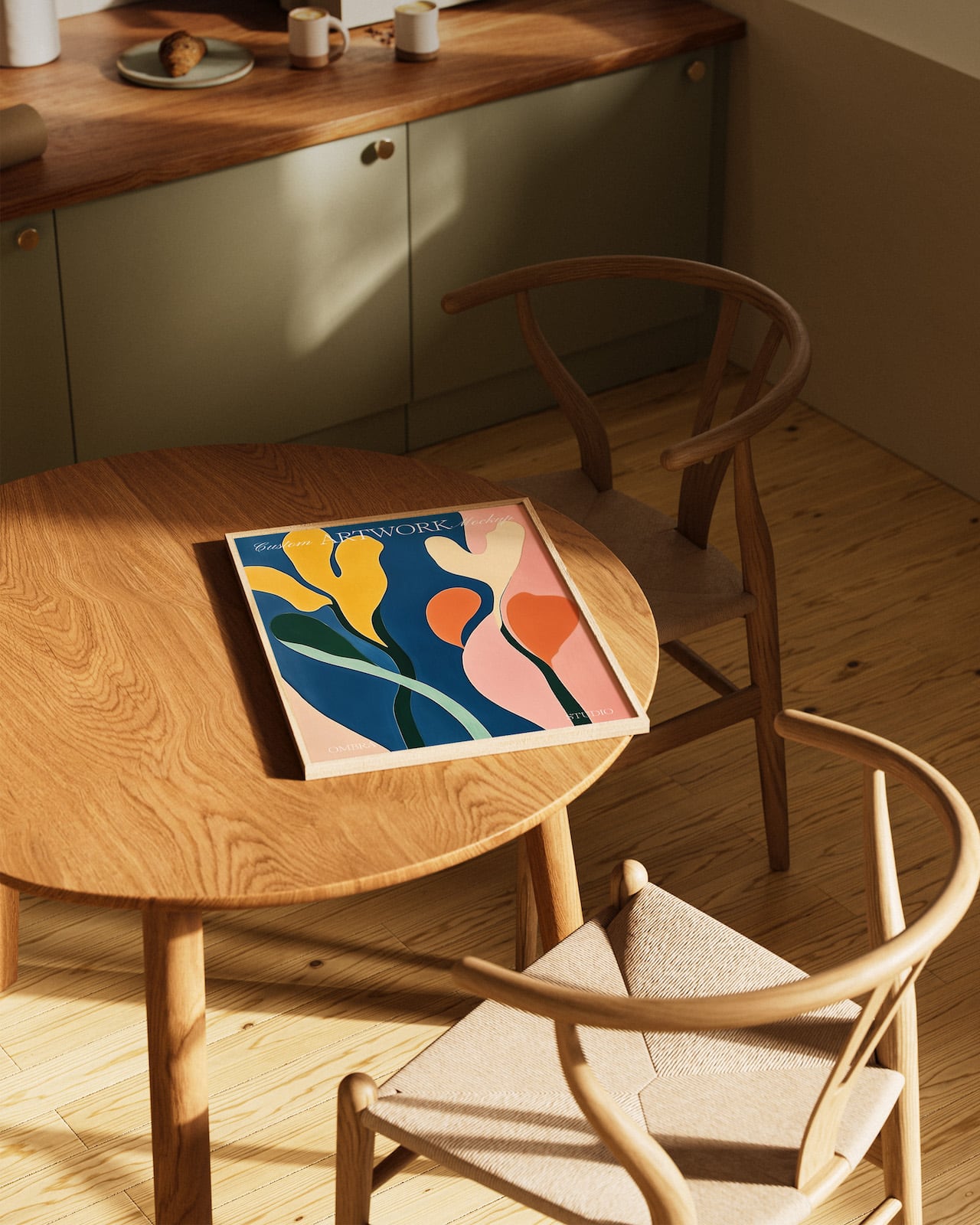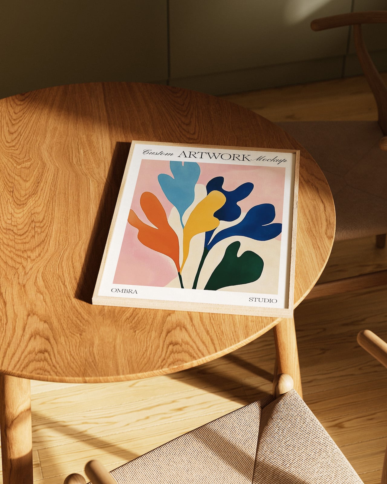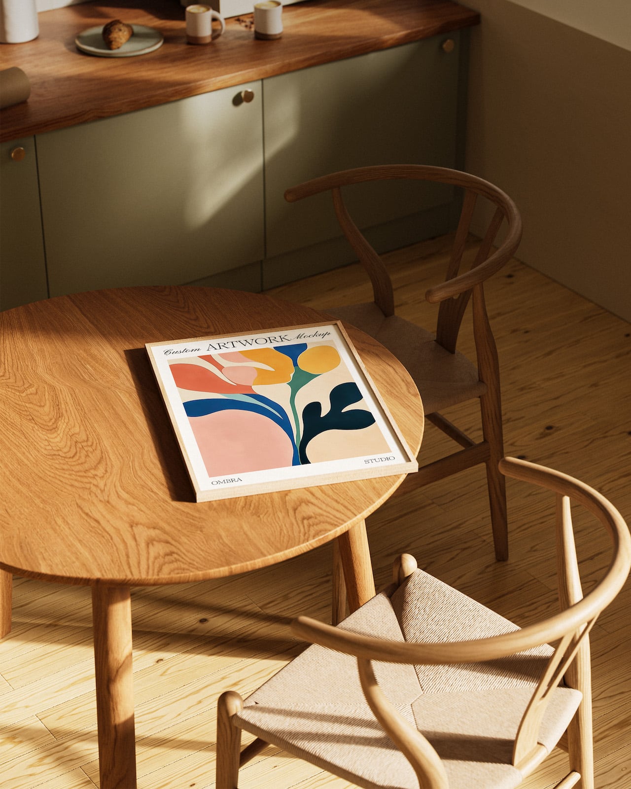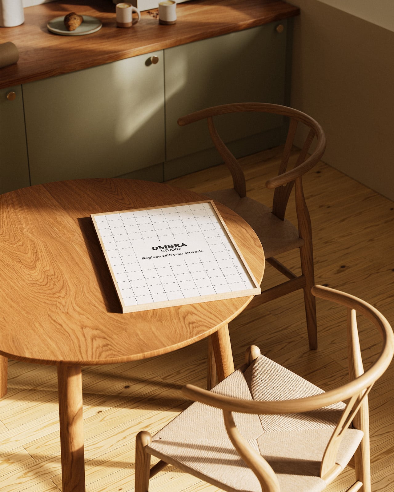 This mockup set features 3 different frame mockups at varying zoom levels and angles featuring a picture frame resting on a wooden kitchen table. Add your artwork or print design via the smart layer in Photoshop.