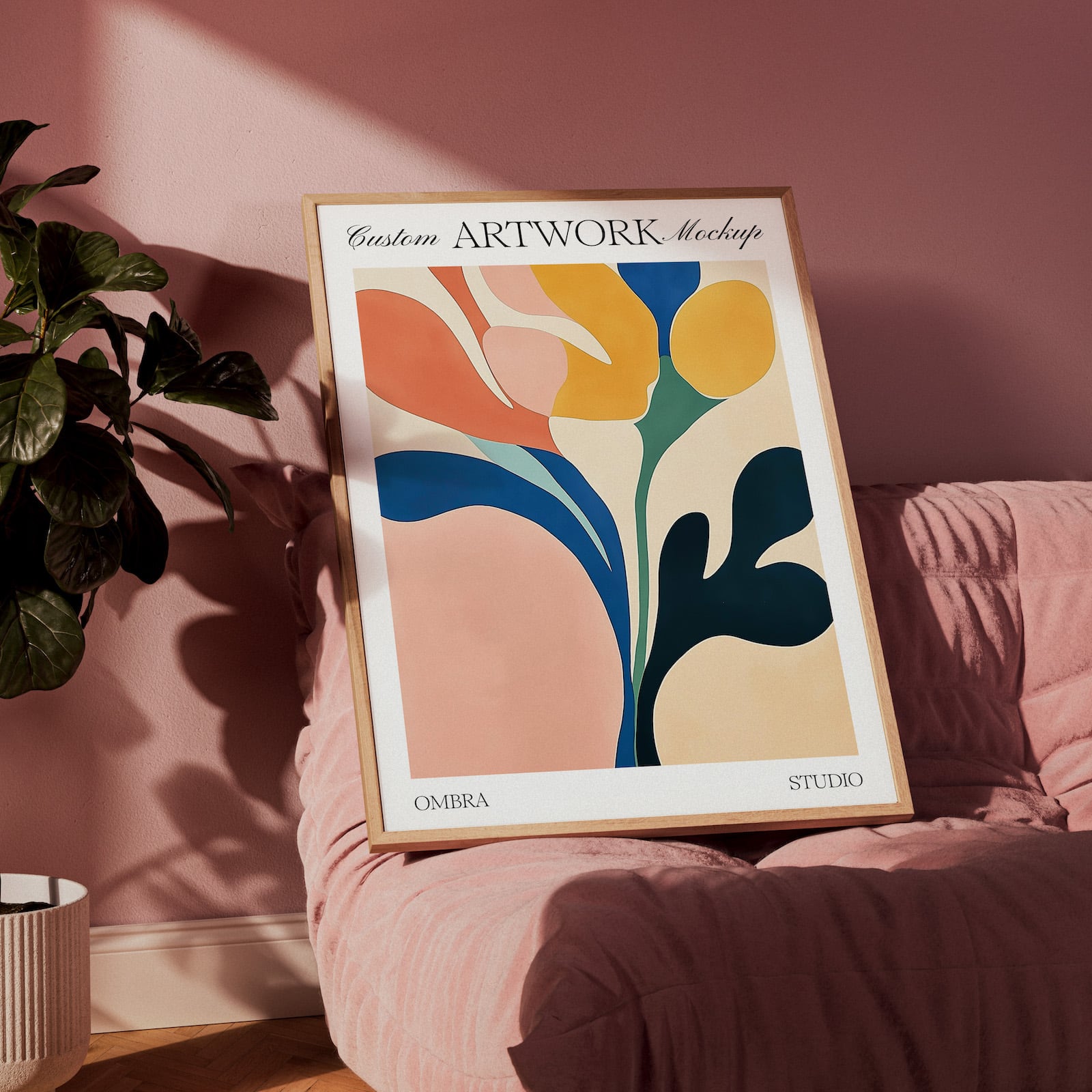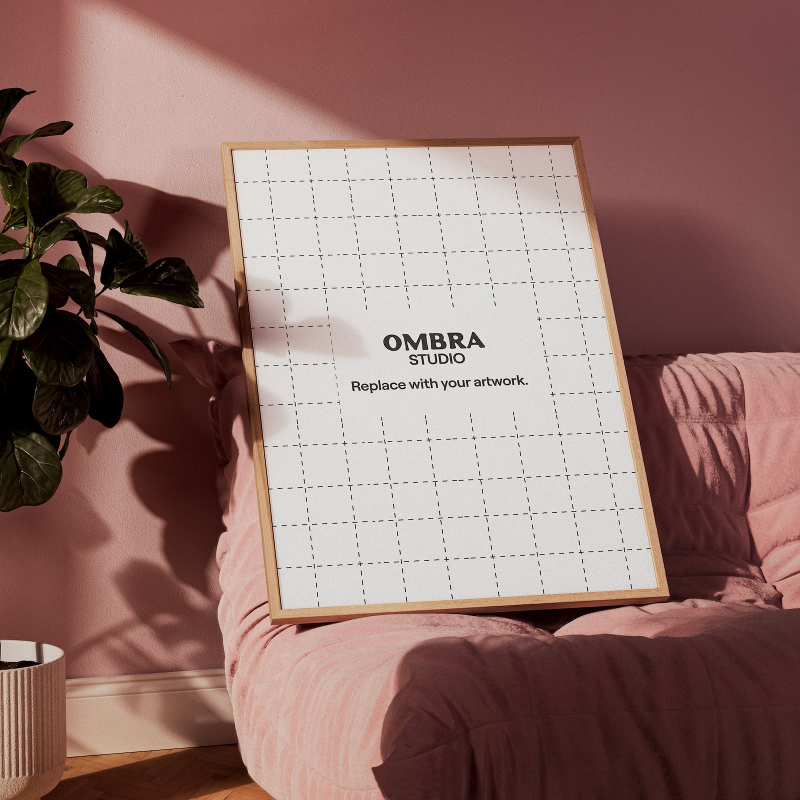Minimal wood frame on pink sofa mockup for Photoshop, PSD file with wooden frame to showcase your artwork or print design.