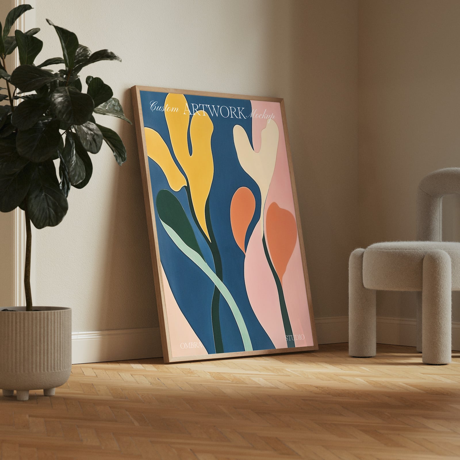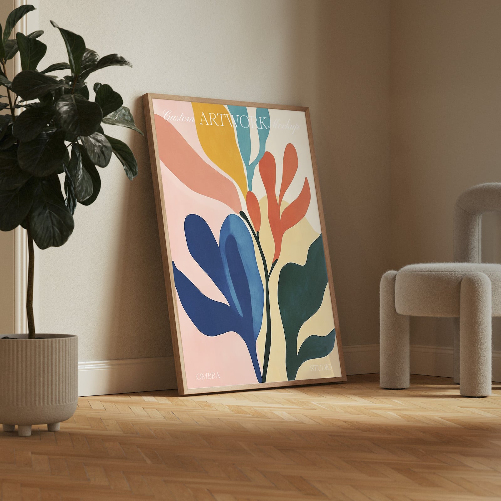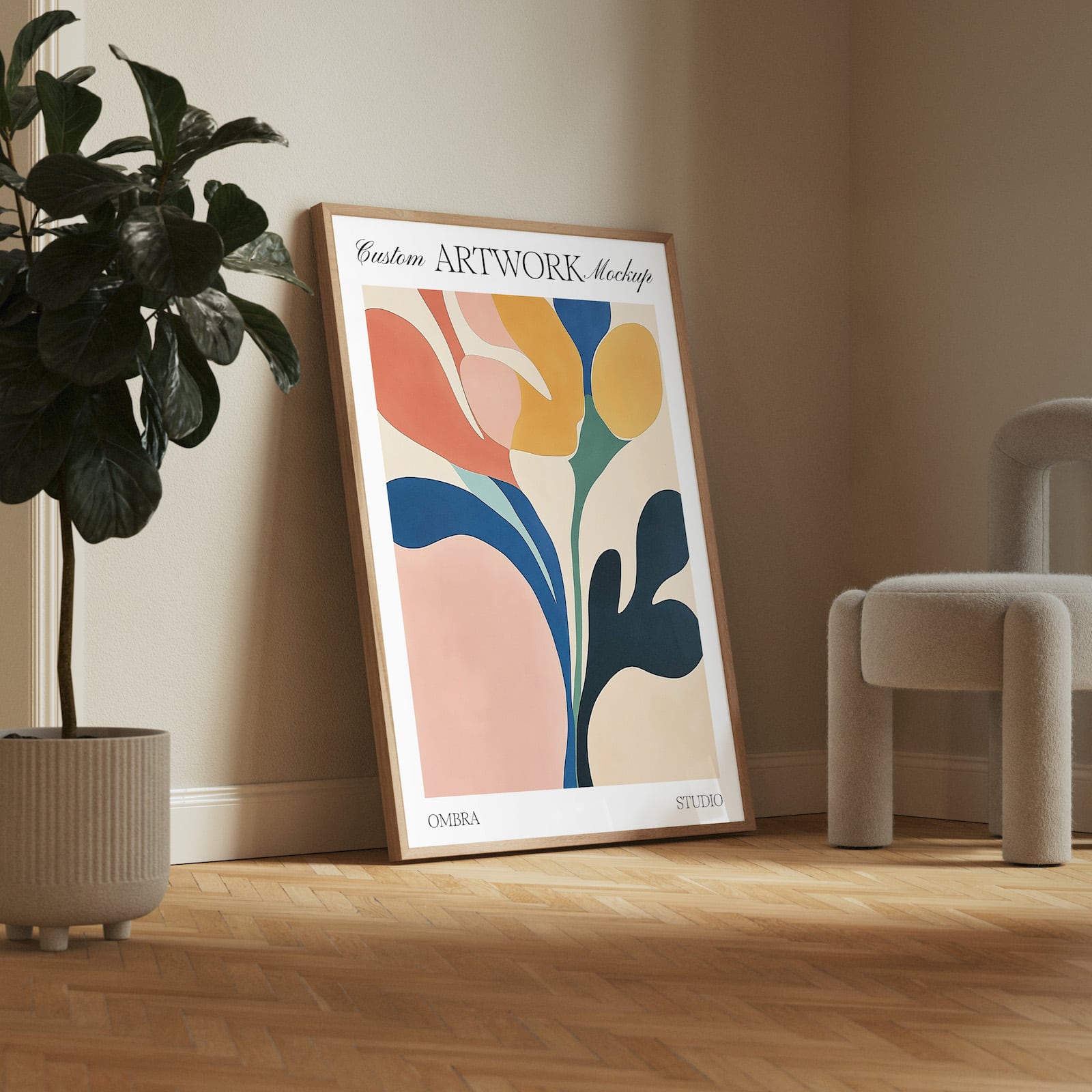 Minimal oak wood frame mockup for Photoshop. PSD file featuring a wooden frame, perfect for showcasing your artwork or print design. This mockup scene includes a fig leaf plant, a stylish chair, and elegant parquet wood flooring, creating a warm and modern setting to enhance your artwork presentation.