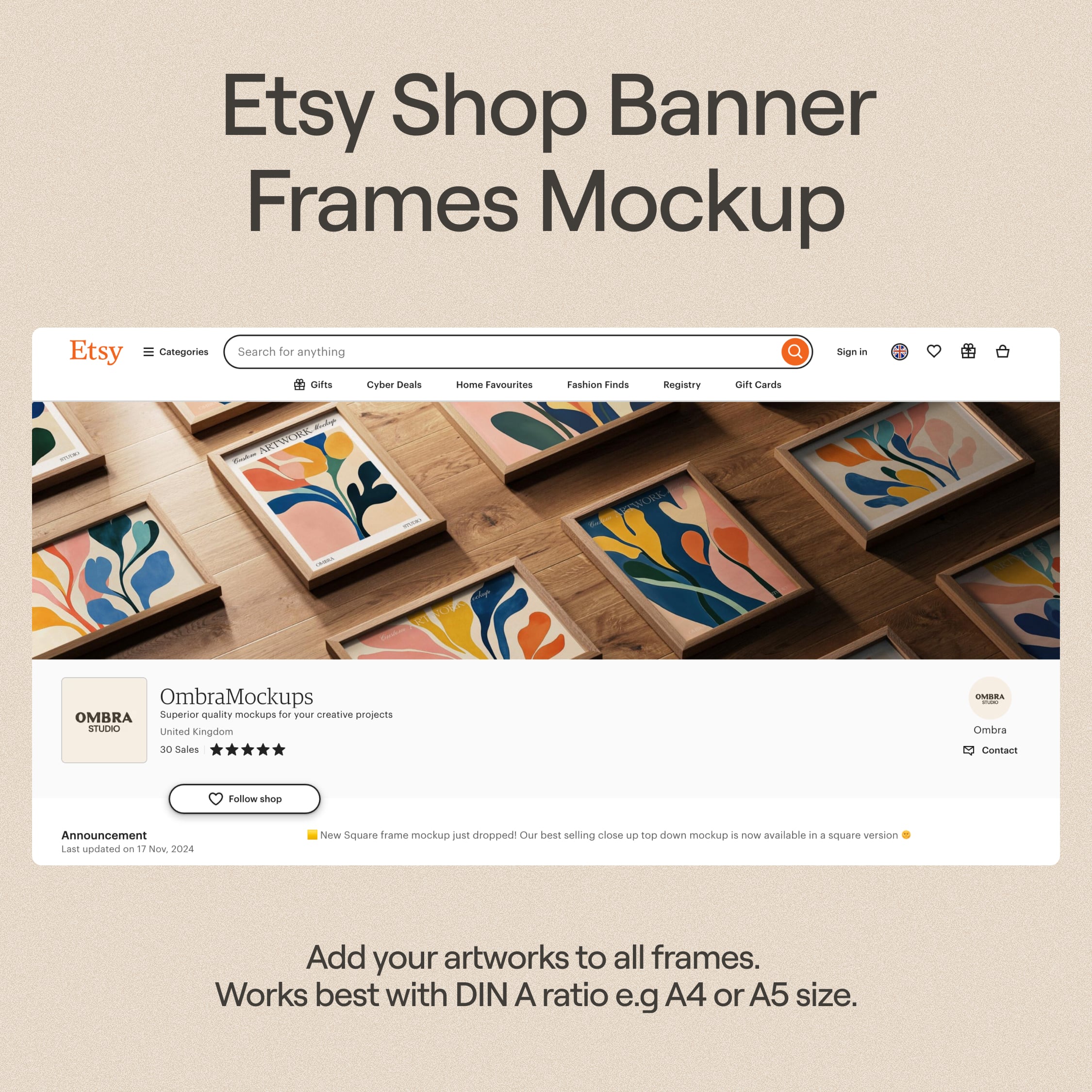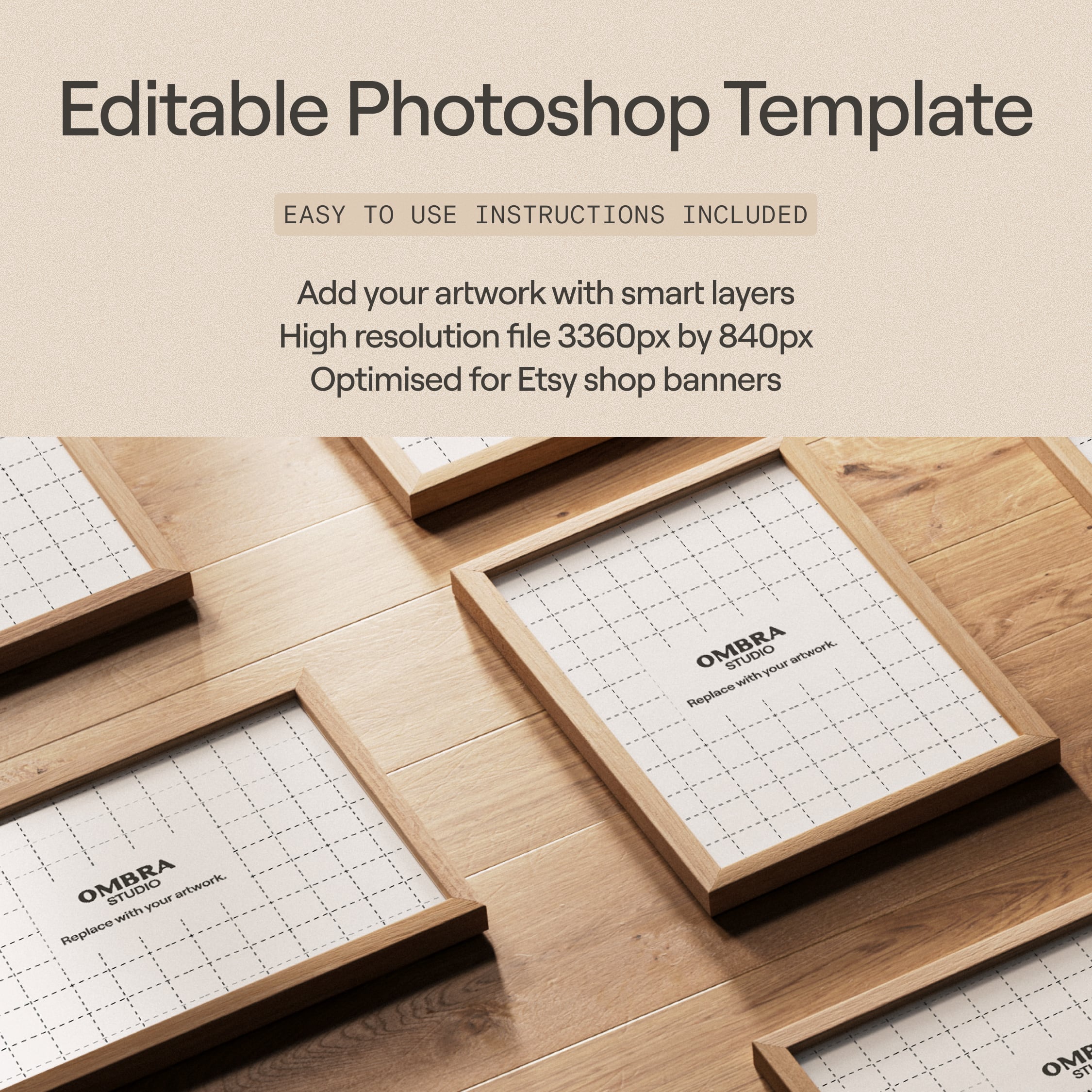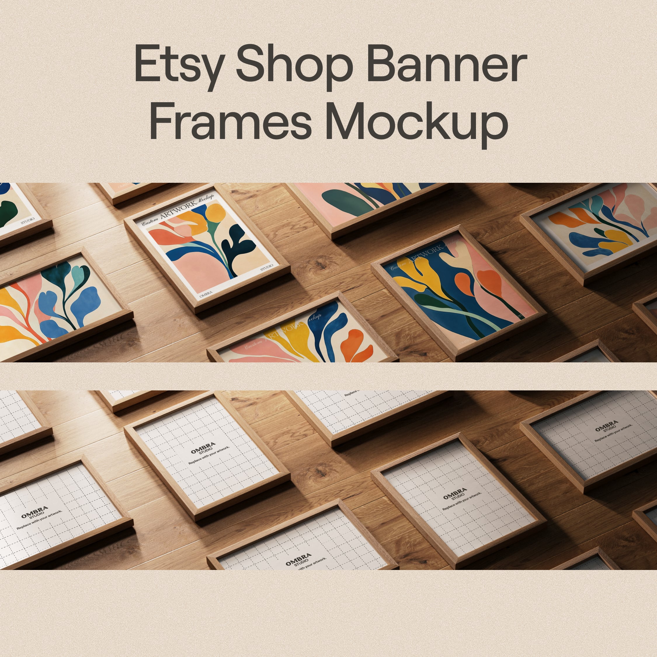 Elevate your Etsy print shop with this frame banner mockup for Photoshop. This PSD file features multiple wooden frames, perfect for showcasing your artworks or print designs and giving your shop a professional look.