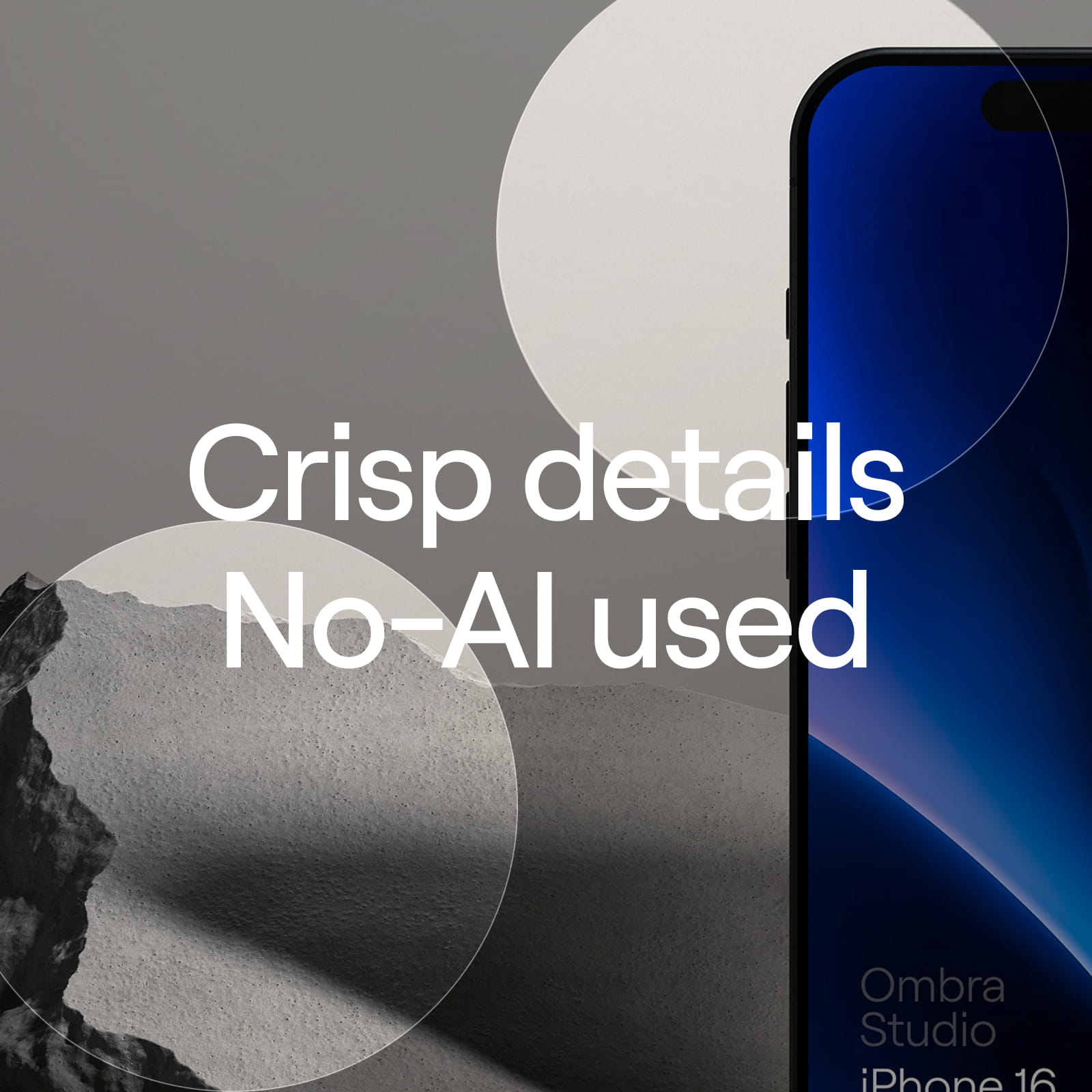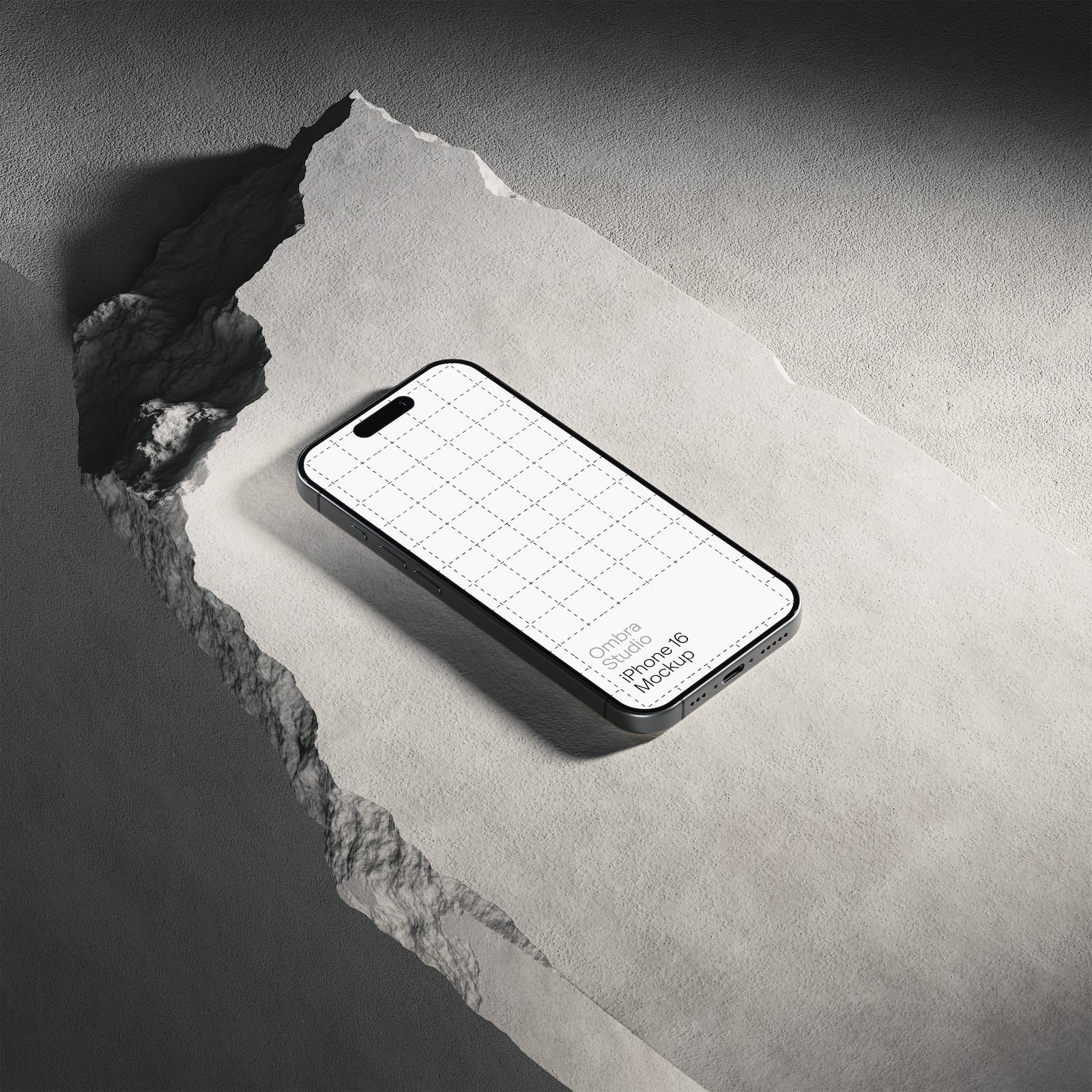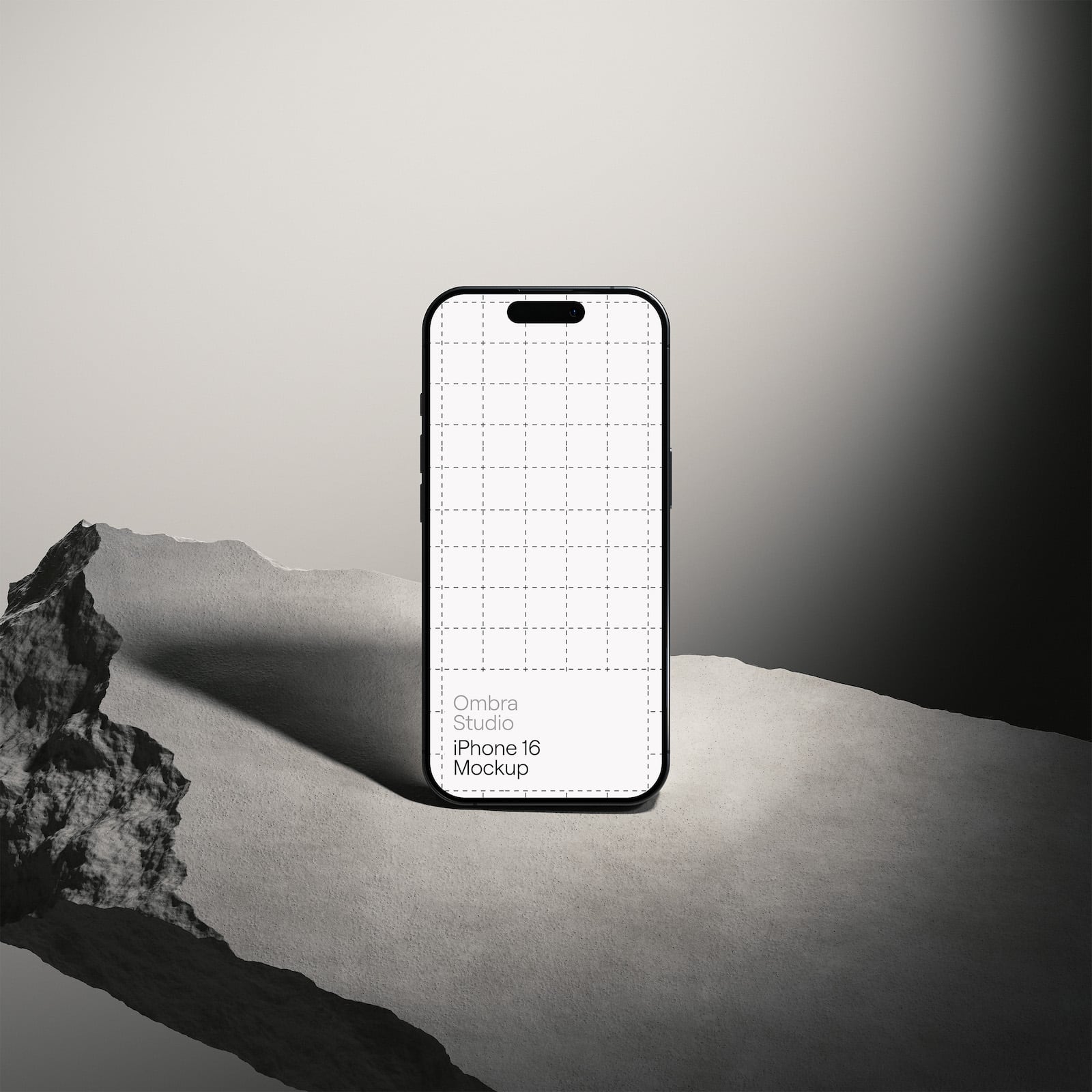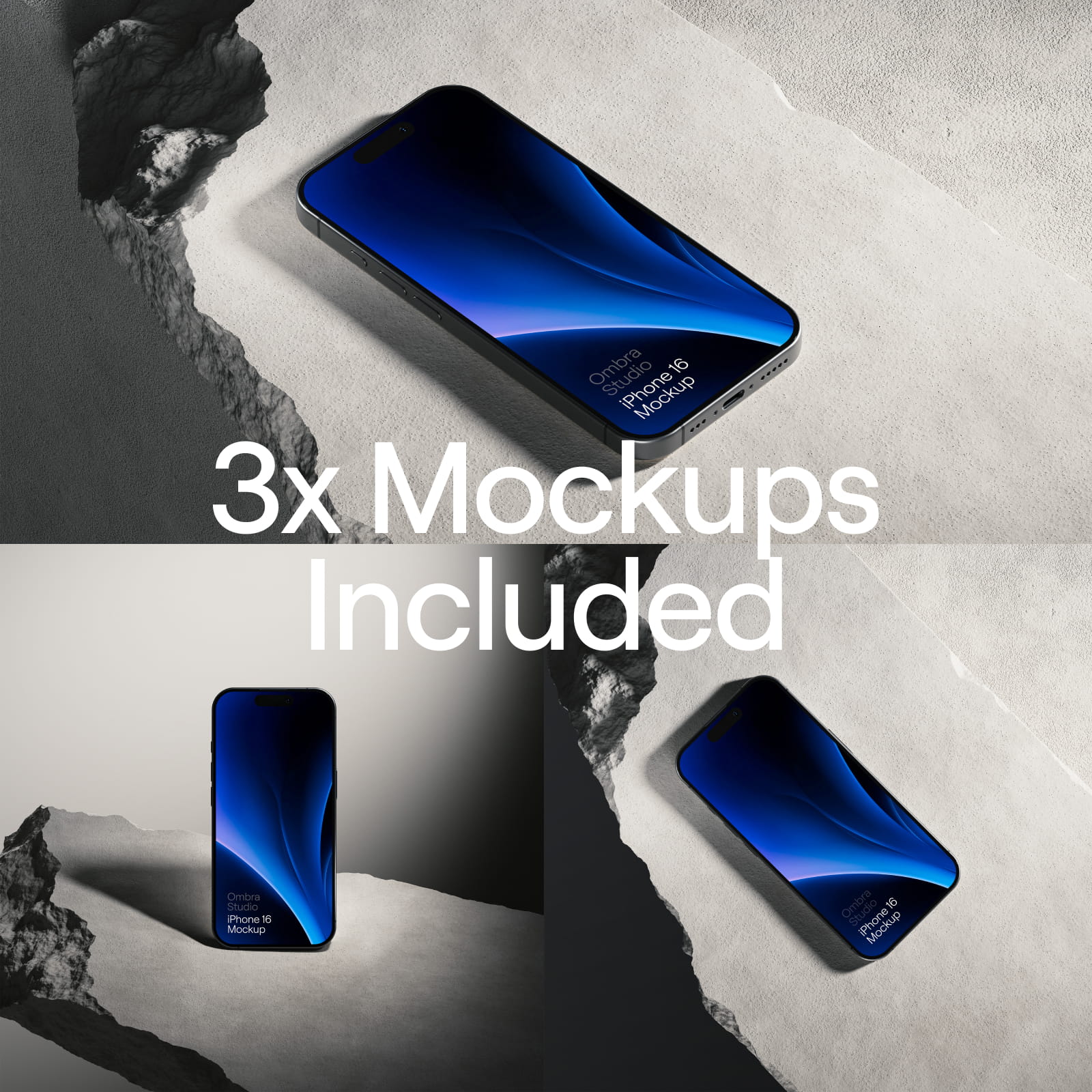 This contemporary set of iPhone Mockups features an iPhone 16 set on stone slabs with high contrast lighting to give your design a stylised and modern look. Includes 3 different angle mockups so you can choose the perfect shot for your presentation.